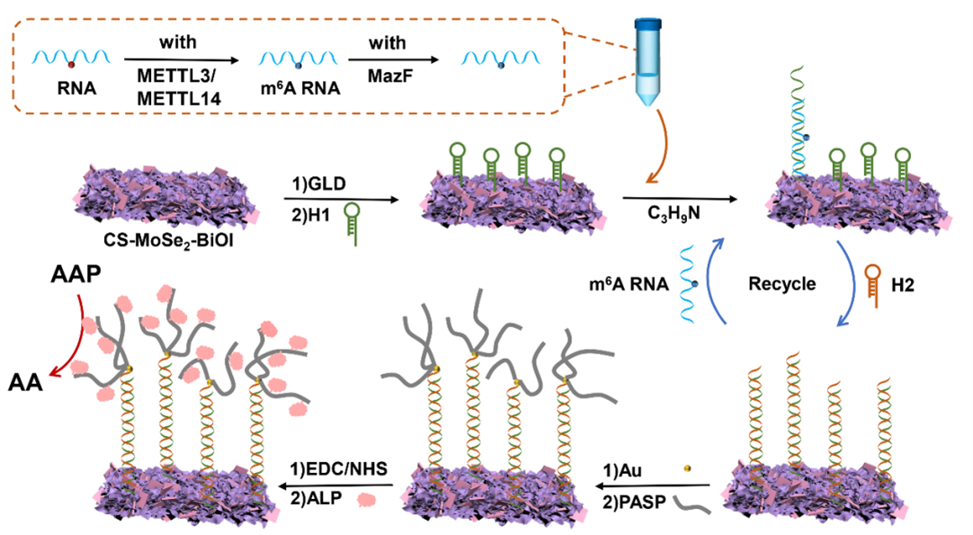 该研究中,利用METTL3/METTL14蛋白对RNA序列中腺嘌呤的甲基化催化活性和MazF蛋白对含有ACA碱基的非甲基化RNA序列的特异性酶切活性,构建了一种同时检测RNA甲基化、METTL3/METTL14蛋白和MazF蛋白的新型光电化学生物传感器。制备了MoSe2-BiOI纳米复合材料,并将其作为光活性材料,采用催化发夹组装策略、聚天冬氨酸负载碱性磷酸酯酶策略和酶催化原位生成电子供体策略,实现了信号放大。在最佳条件下,甲基化RNA、METTL3/METTL14蛋白和MazF蛋白的检测范围分别为0.001 ~ 50 nM、0.001 ~ 25 ng/μL和0.001 ~ 10 U/mL,对应的检测限分别为0.46 pM、0.51 pg/μL和0.42 U/μL。此外,通过评估药物和复合污染物对MazF蛋白活性的影响,评估了所开发的蛋白质检测方法的实用性,证明了所开发的方法在MazF相关疾病药物筛选领域的适用性。并初步探究了污染物对METTL3/METTL14蛋白活性的影响,为RNA甲基化蛋白抑制剂的筛选提供了新的平台。