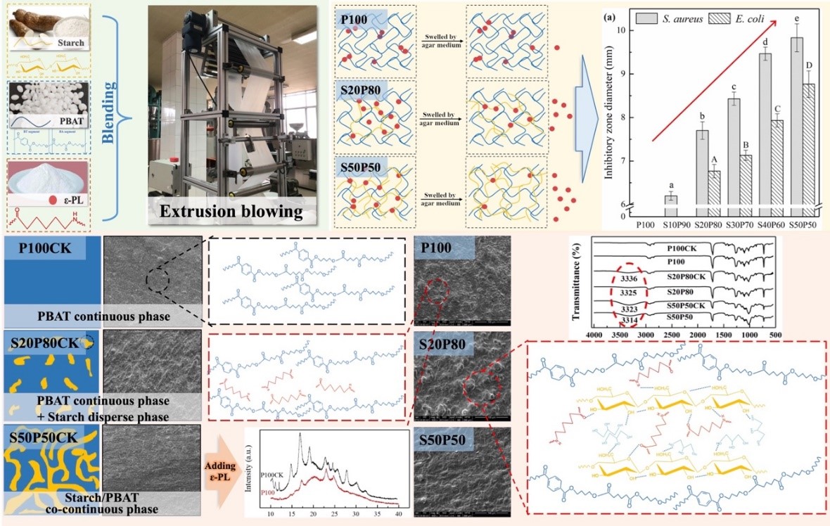 在研究过程中,侯汉学教授团队制备了淀粉含量为0~50%的淀粉/PBAT/ε-聚赖氨酸盐酸盐抗菌吹塑薄膜。研究发现,ε-聚赖氨酸盐酸盐通过氢键与淀粉作用,阻碍了PBAT的结晶。在淀粉相结构由分散相向连续相演变过程中,ε-聚赖氨酸盐酸盐在淀粉相中发生聚集现象。在添加ε-聚赖氨酸盐酸盐的薄膜中增加淀粉含量会导致膜的亮度降低和明显的泛黄,说明挤压过程中美拉德反应增强。在低淀粉含量的淀粉/PBAT薄膜中加入ε-聚赖氨酸盐酸盐后,薄膜强度(42%)、伸长率(18%)和阻湿性(68%)的降幅最大。在相同的ε-聚赖氨酸盐酸盐含量下,淀粉含量为20%的薄膜对金黄色葡萄球菌和大肠埃希菌均有扩散抑制作用,且抑制作用随淀粉含量的增加而增强。