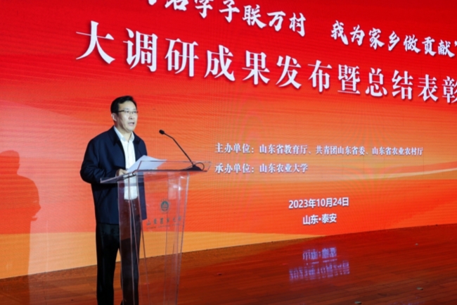 徐剑波在致辞中介绍了学校开展“万名学子联万村,我为家乡做贡献”大调研活动基本情况和取得成果,感谢省教育厅、团省委、省农业农村厅、建设银行、农业银行、山东广播电视台等单位对大调研的大力支持。他说,本次大调研实现了对山东省内行政村的全覆盖,扩大了学校的影响力,强化了师生爱农情怀,提升了兴农本领,完成了阶段性任务,开启了学校服务全面推进乡村振兴、打造“齐鲁样板”,服务农业强国建设的新局面。徐剑波表示,下一步,米兰milan官方网站将深入总结经验、发扬优势,持续加大服务力度,按照产业分类组建专家工作群为乡村发展解难题,深化学校人才培养模式改革,建立联系服务基地、搭建科技服务平台,逐步构建全省乡村发展的动态数据库,为加快农业强省建设提供全面、详细的数据支撑,进一步推动大调研走深走实,努力将其打造成为我省省属高校服务乡村振兴的靓丽品牌。希望与各参与单位携起手来,在与国家行动同频共振中,在落实全面推进乡村振兴、加快建设农业强国的火热实践中,共同努力交出一份满意的答卷。