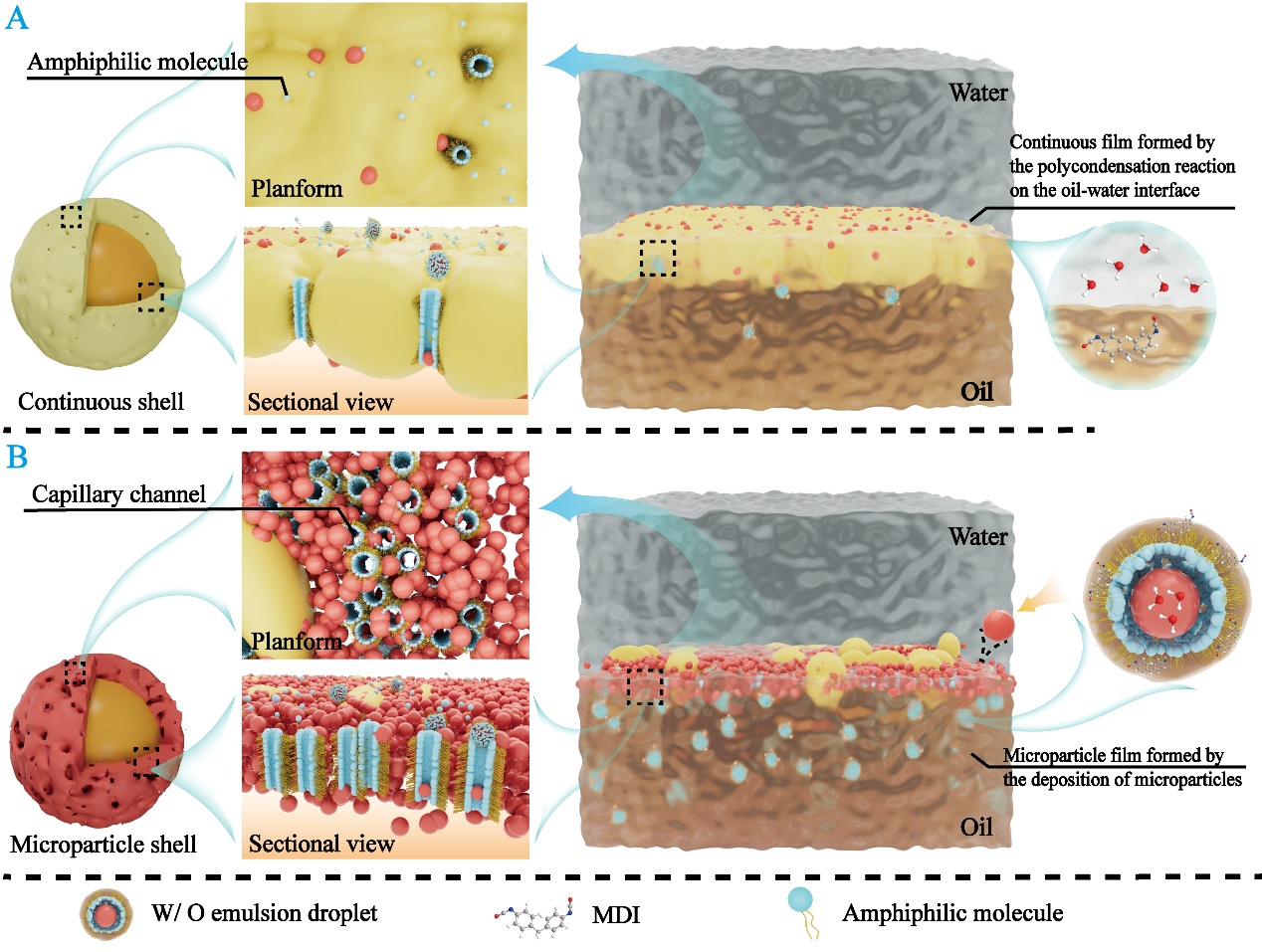 该研究系统揭示了在界面聚合过程中两亲分子对水相传质和囊壳结构的关键调控作用。研究发现,聚羧酸盐(PCE)可形成反胶束,将水相以乳滴形式跨界面输运至油相,进一步,乳滴中的水与异氰酸酯反应生成微米级颗粒,最终形成多孔的“微粒型”界面膜;而木质素磺酸钠(SL)作为两亲分子时,界面缩聚过程则倾向于形成致密连续的界面膜(图2)