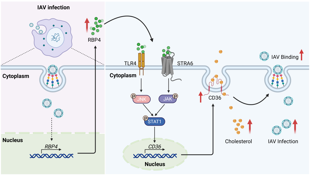 IAV作为一种重要的人畜共患病原体,持续威胁全球公共卫生安全。该病毒的生命周期依赖于呼吸道上皮细胞和巨噬细胞等宿主细胞。近年研究表明,IAV感染与宿主脂质代谢之间存在密切相关,但具体的调控机制尚不明确。本研究发现,在IAV感染的细胞模型和临床患者标本中,RBP4的表达均显著上调。敲除RBP4可在体内外显著抑制IAV的复制,表明RBP4是IAV感染的关键宿主因子。在机制上,RBP4通过激活JNK-STAT1或JAK-STAT1信号通路,上调胆固醇摄取受体CD36的表达,进而提高细胞内胆固醇水平。胆固醇的积累进一步增加了细胞膜表面的唾液酸含量,从而促进IAV的附着与内化过程。在RBP4缺失的细胞和小鼠中恢复CD36表达,能够有效挽救病毒的复制能力,证明CD36是RBP4介导促感染作用的下游效应分子。