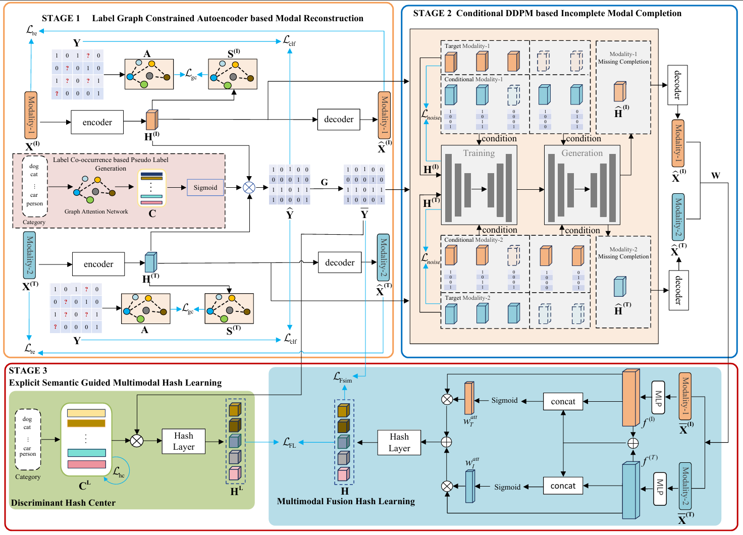 随着互联网和人工智能的快速发展,海量的图像、文本等多模态数据不断涌现。这些数据从不同角度描述同一对象,蕴含丰富的互补信息。如何高效地融合和检索多模态数据,成为多媒体计算与人工智能领域的重要研究方向。然而,实际场景中由于数据损坏、缺少标注或用户输入不全导致模态缺失问题。同时,多标签数据中常见的部分标签缺失也进一步影响了检索性能。